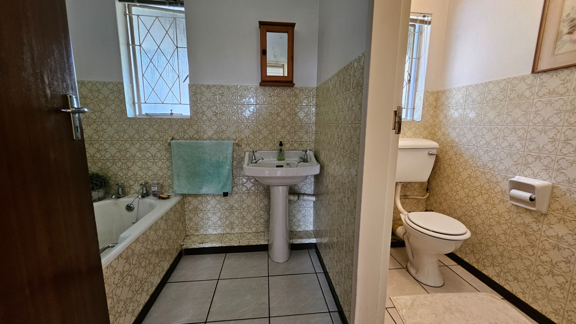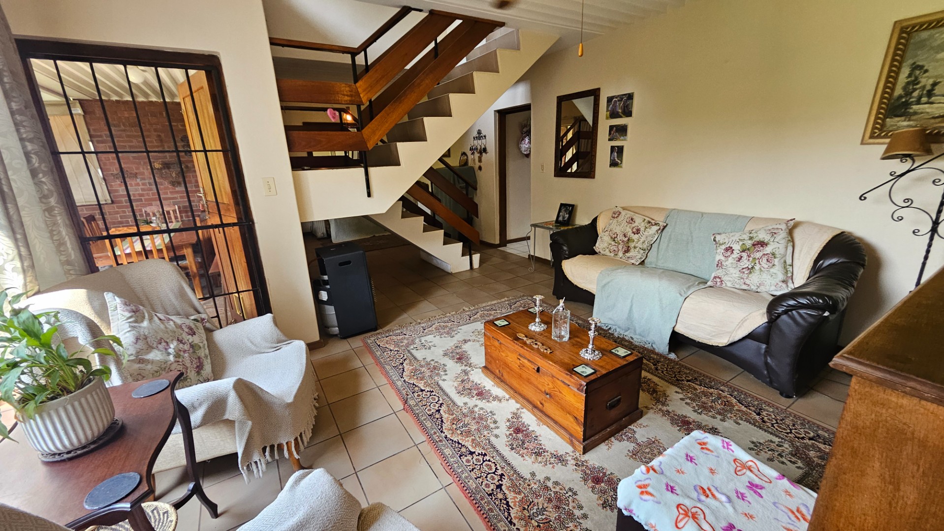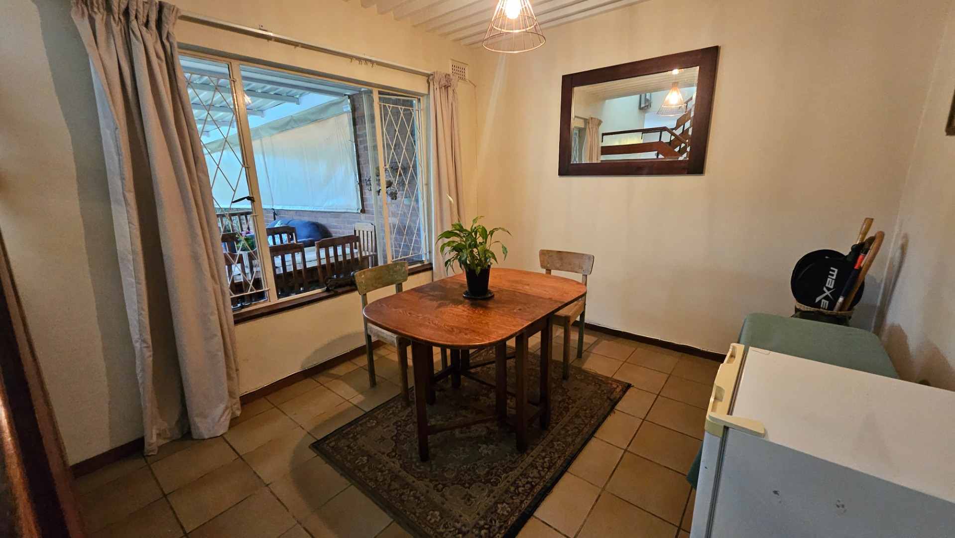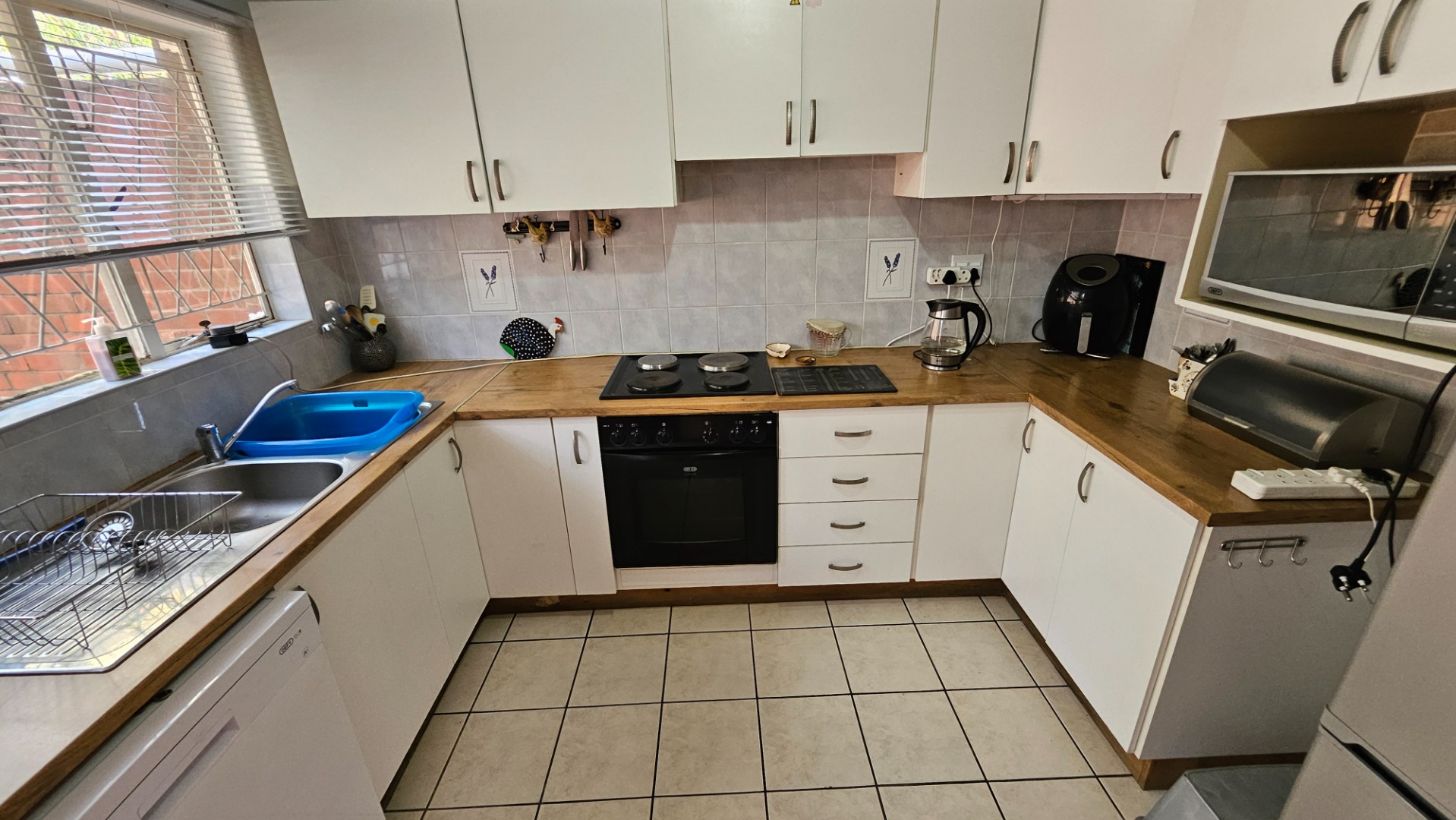 The lower level features the living space, with a comfortable lounge and a dining room that flow seamlessly onto a spacious entertainment deck and a well-established, fully enclosed garden, perfect for relaxed outdoor living. The kitchen is fully fitted with ample cupboards, a built-in oven and hob, and plumbing for a dishwasher or washing machine. It also opens to a secure courtyard with a washing line. A guest toilet and basin are conveniently located downstairs.